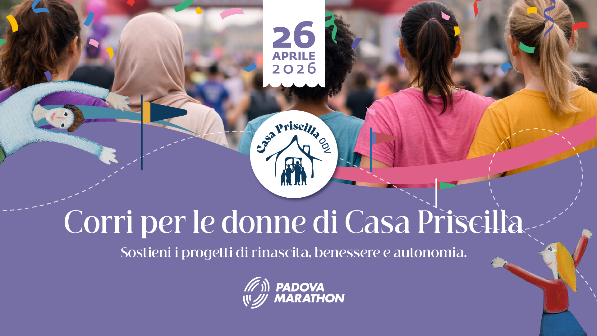 Alla Padova Marathon 2026 Casa Priscilla corre per le donne e le mamme accolte: con questa campagna vogliamo raccogliere 10.000 euro per sostenere percorsi di supporto psicologico individuale, incontri di gruppo e attività dedicate al benessere psicofisico, per aiutare le donne accolte a ritrovare equilibrio, forza e consapevolezza.